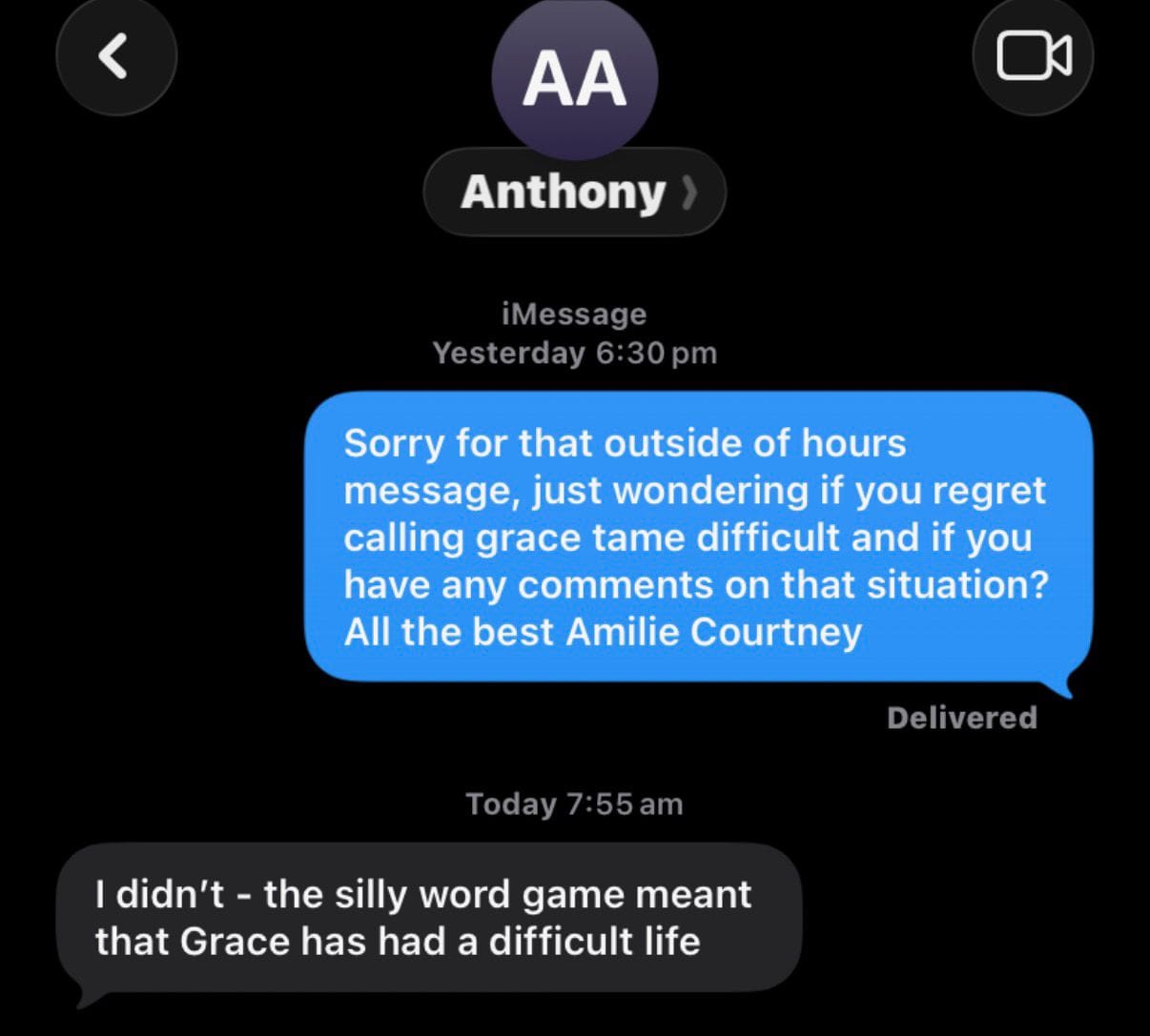 In a message exchange seen by Ette Media, a member of the public sent a text to the Labor leader asking: “if you regret calling Grace Tame difficult and if you have any comments on the situation?”